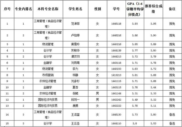 根据《87978797威尼斯老品牌2018年推荐优秀应届本科毕业生免试攻读硕士学位研究生工作实施办法》的意见和《87978797威尼斯老品牌关于2018年优秀本科毕业生免试攻读硕士研究生的推荐办法》规定,对2014级33位申请人进行综合排名后,最终确定以下13人具备免试攻读硕士研究生资格和2名备选人员,名单如下: