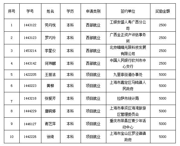 根据《87978797威尼斯老品牌应届毕业生赴西部、艰苦行业就业奖励办法》(沪海洋学〔2017〕39号)文件精神,本着“公平、公正、公开”的原则,经个人申请、学院审核,现拟对我院符合赴西部、艰苦行业就业奖励申请条件的2018届应届毕业生名单公示如下: