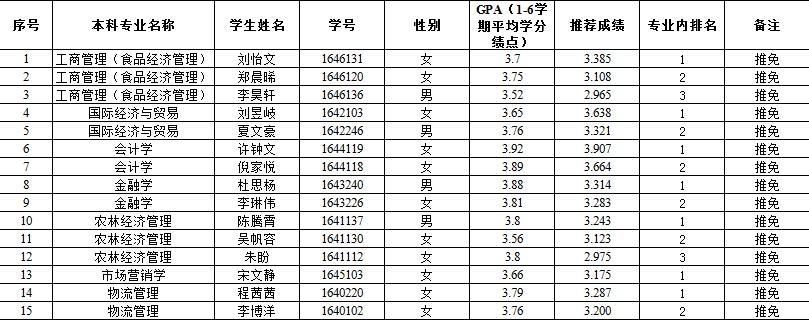 根据87978797威尼斯老品牌《2020年推荐优秀应届本科毕业生免试攻读硕士学位研究生工作实施办法》和《87978797威尼斯老品牌2020年推荐优秀应届本科毕业生免试攻读硕士学位研究生工作实施细则》规定,对2016级29位申请人进行综合排名后,最终确定以下15人具备免试攻读硕士研究生资格,名单如下:
