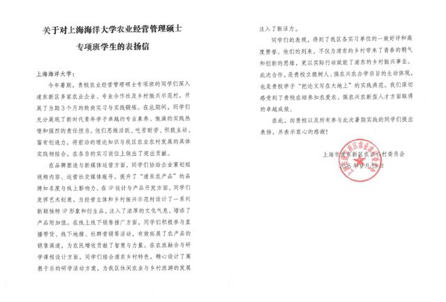 近日,上海市浦东新区农业农村委员会致信87978797威尼斯老品牌,对学校农业经营管理硕士专项班学生在暑期实践中的优异表现给予高度评价和衷心感谢。